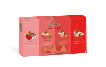 I confetti Maxtris Sfumati Rosso sono realizzati con mandorle tostate (18 %) ricoperte da cioccolato bianco, al latte e gianduia, selezionati in gusti assortiti come nutella, muffin, crème caramel, caramello e fleur de sel, rifiniti da un velo sottile di zucchero rosso sfumato. Confezionati in scatola da 1 kg (circa 130–150 pezzi), sono prodotti artigianali italiani certificati senza glutine.