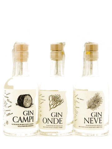 Degustazione di Gin di G.C. Spirits, formata da tre miniature da 10 cl di London Dry: Neve dai toni balsamici e alpini, Campi dai sentori di fieno e crema di latte, Onde dai profumi costieri e una sapidità spiccata.