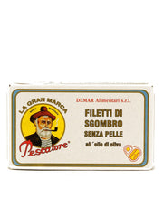 Filetti di Sgombro delle Azzorre in olio di oliva di altissima qualità, prodotti dall'azienda Pescatore direttamente sul luogo di pesca.