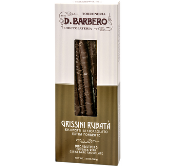I Grissini Rubatà ricoperti di cioccolato di Barbero sono l’incontro tra la tradizione piemontese del grissino Rubatà e la dolcezza intensa del cioccolato extra fondente. Questi bastoncini gustosi e croccanti vengono immersi nel cioccolato fondente e diventano una novità apprezzata da chi ama sapori decisi, senza perdere il carattere del pane piemontese.
