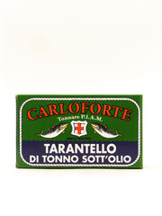 Dall antica tradizione di Carloforte, solo ed esclusivamente Tonno Rosso di corsa lavorato interamente a mano. Il Tarantello viene poi posizionato nelle latte e ricoperto con olio d'oliva. Il prodotto viene poi sterilizzato. A questo punto è pronto per la 'fase di impaccamento' un periodo di maturazione, in cui le carni tendono a compattarsi e acquisire sapore. Come per i grandi vini anche il tonno ha bisogno di questo periodo di maturazione che nel nostro caso è di sei mesi.